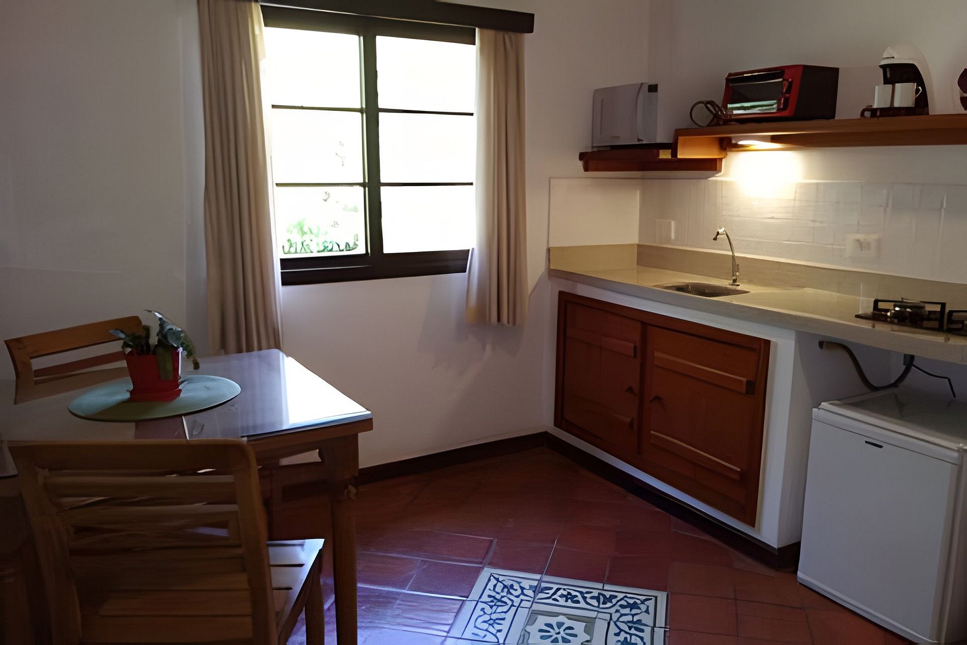 Cozinha nos chalés - Os chalés estão equipados com cozinha compacta: cooktop, microondas, frigobar, forninho elétrico, cafeteira e utensílios de cozinha.