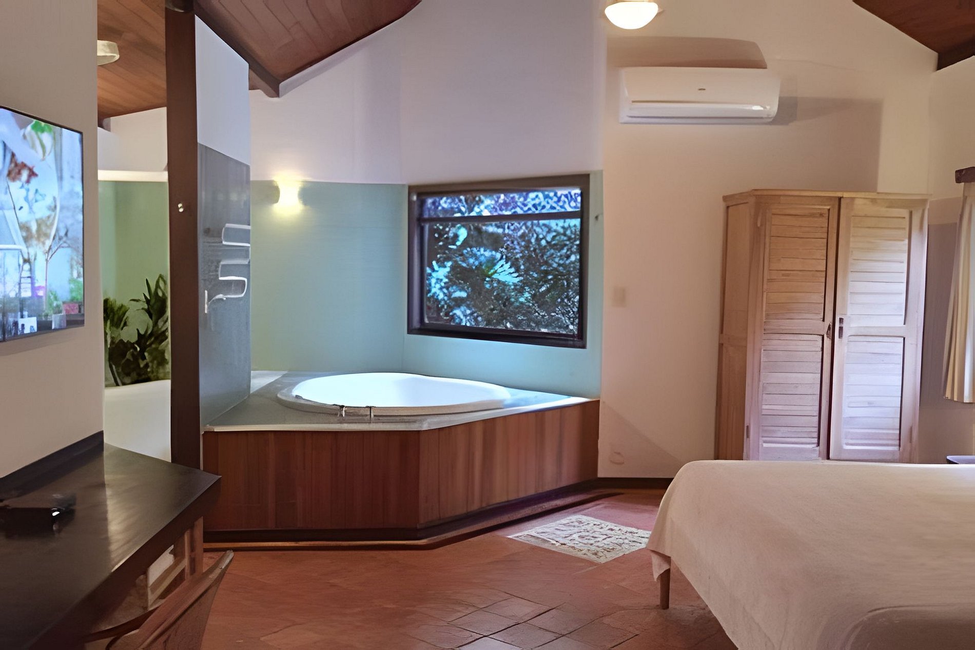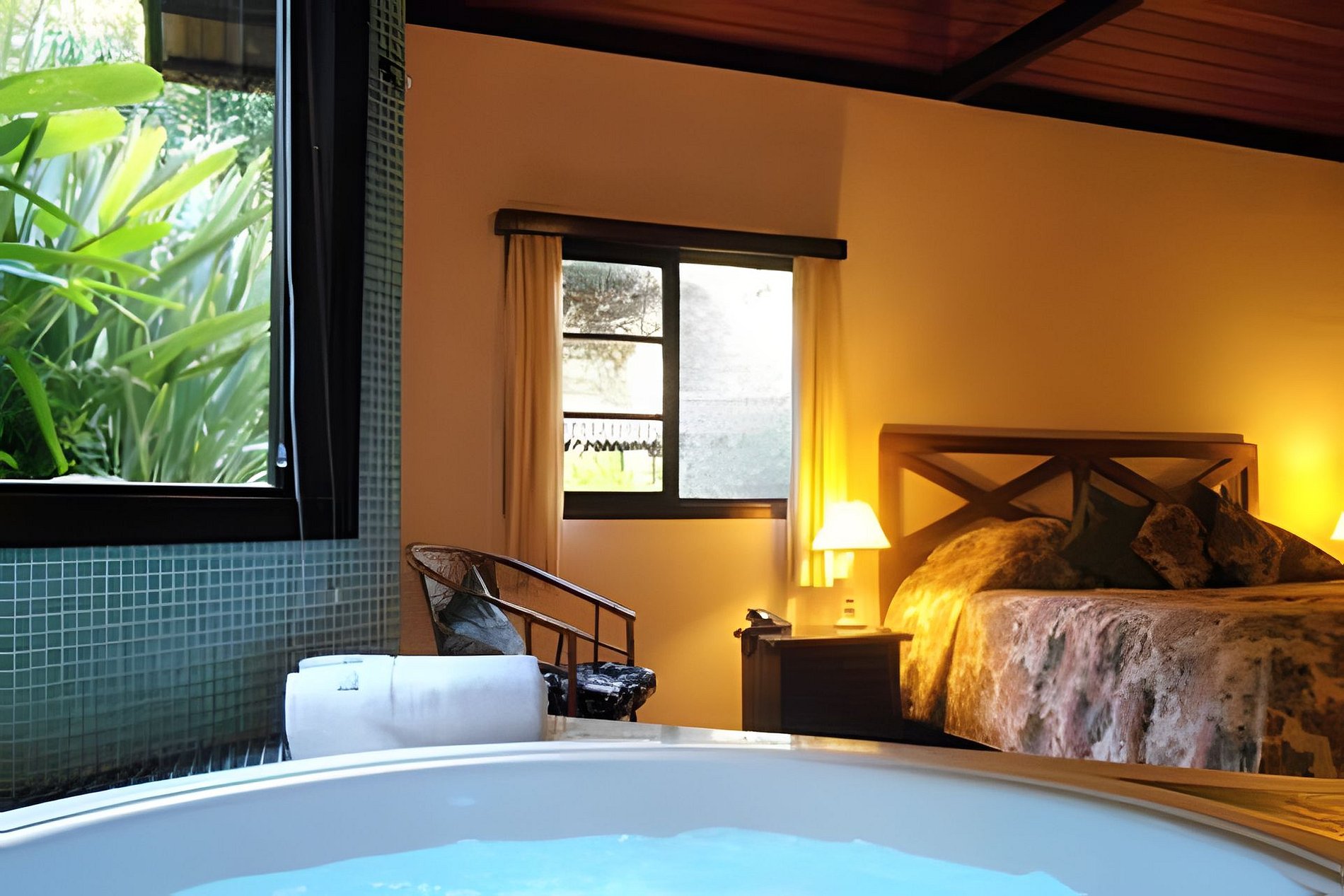 Um loft charmoso em meio à natureza com hidromassagem dupla, cama king size, lareira, ar condicionado inverter quente e frio e TV smart de 50' com NETFLIX e a cabo Sky. Wi-fi em todo chalé. Cozinha compacta bem equipada com microondas, forninho elétrico, cooktop, cafeteira, frigobar e utensílios.